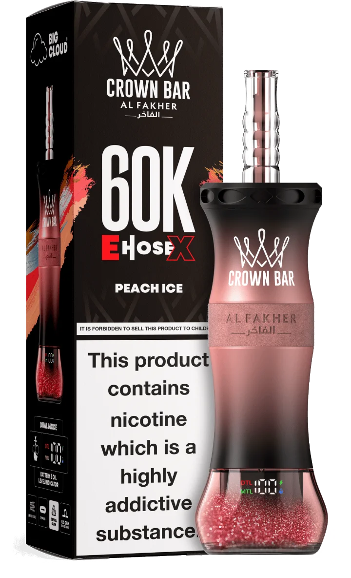 Al Fakher Crown Bar E Hose X 60000 Puffs Disposable Vape represents the absolute pinnacle of high-capacity vaping devices, setting a new benchmark for longevity and shisha-inspired performance. Designed for enthusiasts who demand weeks, not days, of usage, this device boasts an incredible 60,000 puff capacity, powered by a robust rechargeable battery and a massive e-liquid reservoir. It is engineered to replicate the authentic, voluminous clouds of a traditional hookah session.With a massive 60,000 puff capacity, it promises longevity far beyond most disposable vapes on the market.